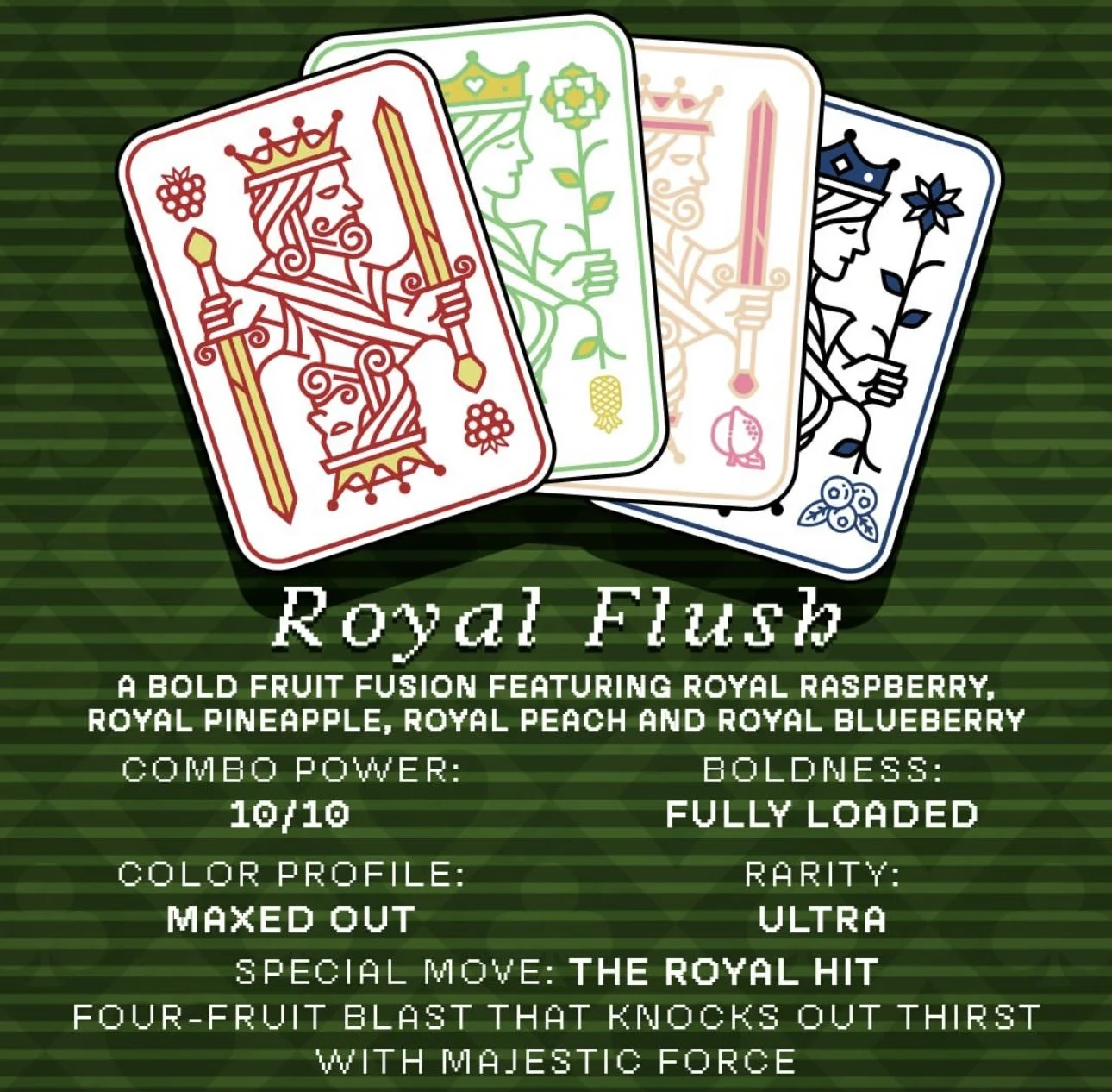 Aesthetic: Play on a Royal Flush playing card, using summer colors like orange, pink, yellow, and blue to represent raspberry, pineapple, peach, and blueberry
